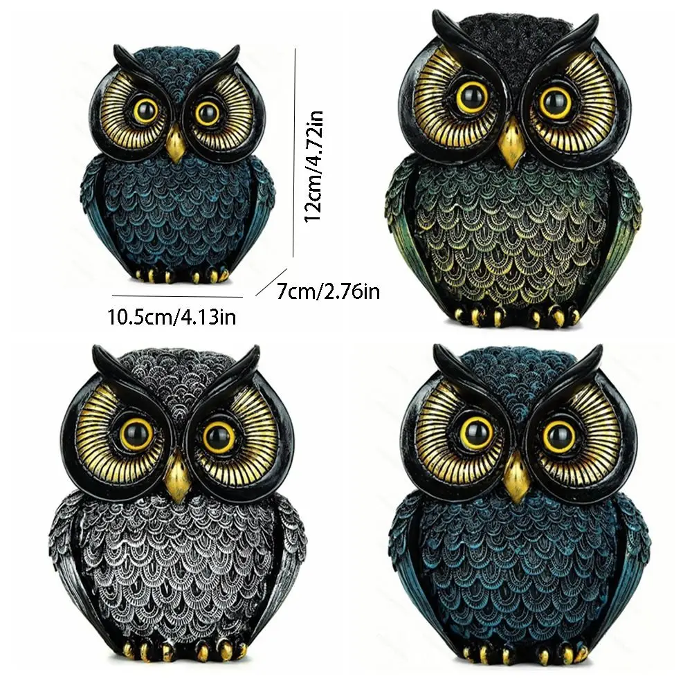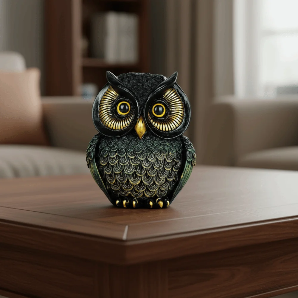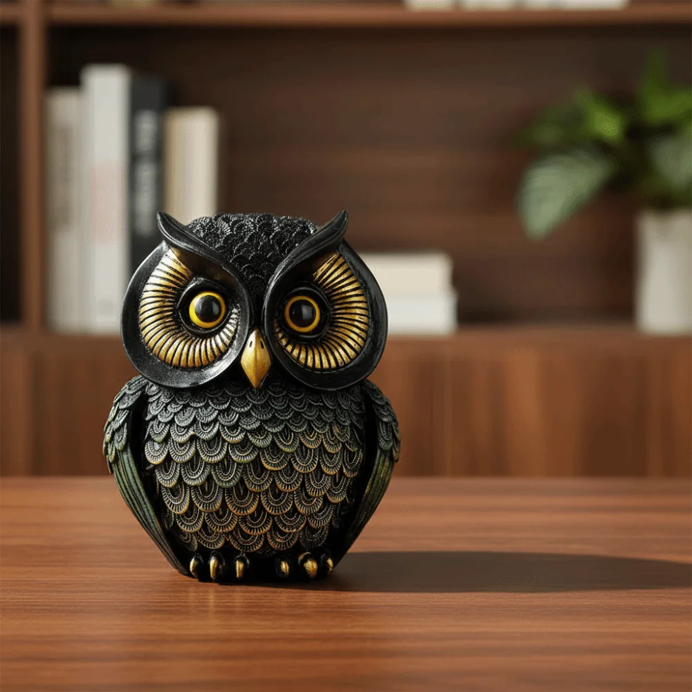 Every individual feather across the body is hand-etched with layered scale patterns and decorative mandala motifs, creating a texture that catches light differently across the curved surface. The oversized eyes are rendered in concentric ribbed gold with obsidian-black resin pupils - the focal point of the composition and the element that gives each piece its distinctive presence. A hand-applied antique patina finish layered over the base color creates depth between raised feather details and recessed areas, replicating the appearance of aged bronze or oxidized copper.