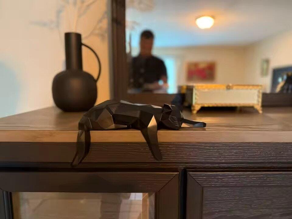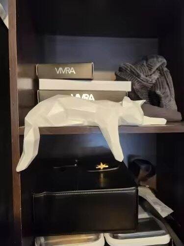 Geometric abstraction that happens to be cat-shaped. Museum-quality resin construction. Matte finish that photographs beautifully. The design language of high-end home stores and architectural magazines.