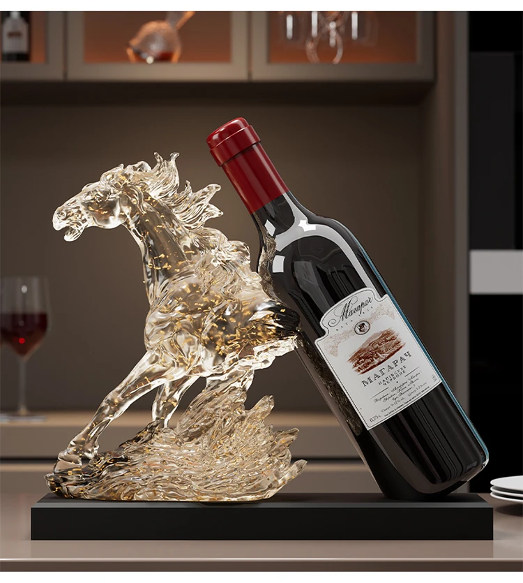 The craft: High-quality resin construction with hand-applied finishes creating matte black, pure white, crystal-clear transparency, or champagne amber translucency. The dynamic rearing pose requires precise engineering for structural balance when supporting bottle weight. Anatomical musculature, flowing mane, and wave base are carefully sculpted with dimensional detail visible from all angles. The integrated bottle cradle provides secure angled support while maintaining visual integration with the sculptural form. Each piece undergoes quality inspection ensuring finish consistency, structural integrity, and reliable bottle-holding function.