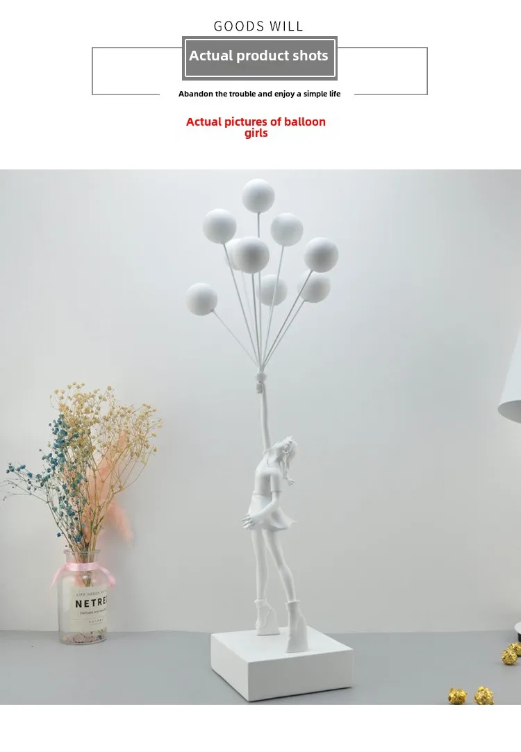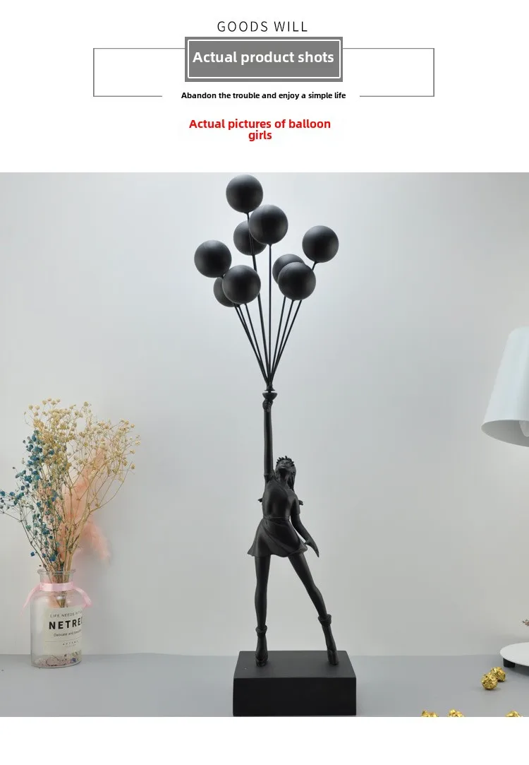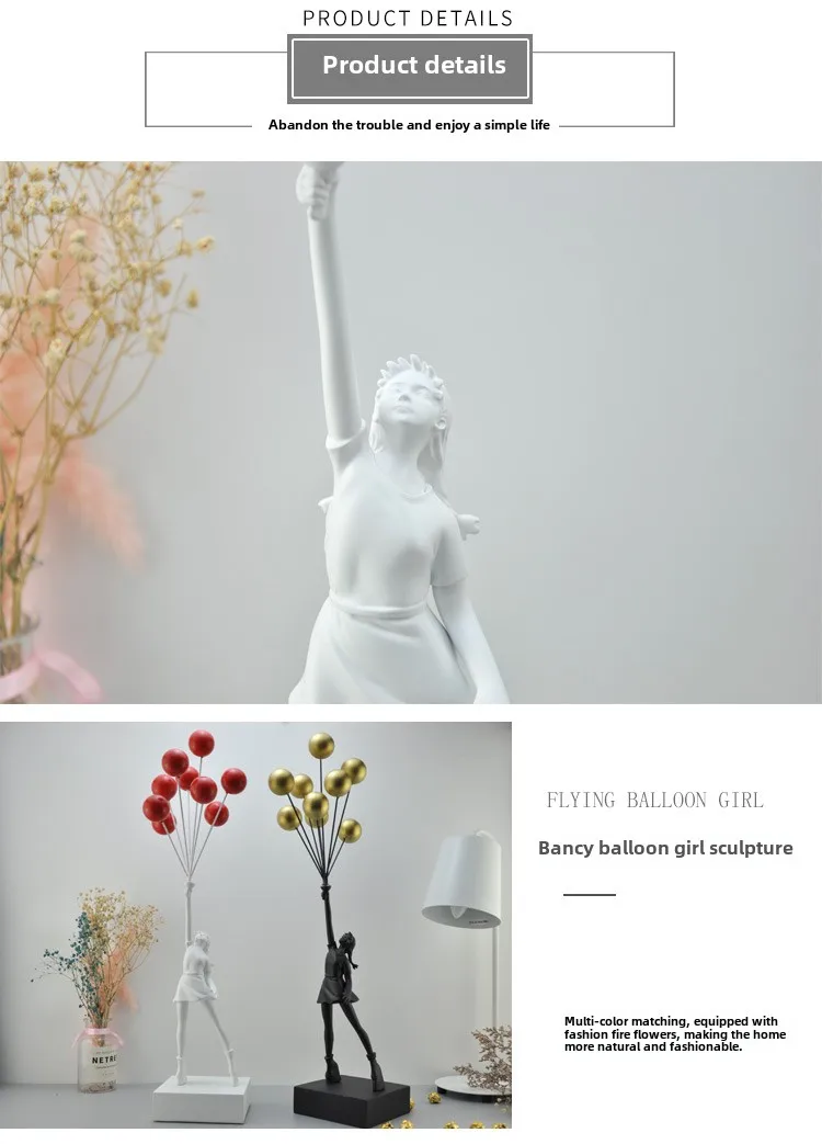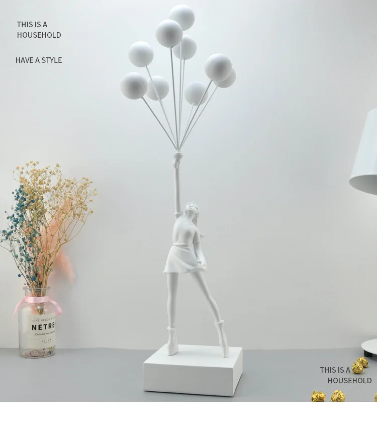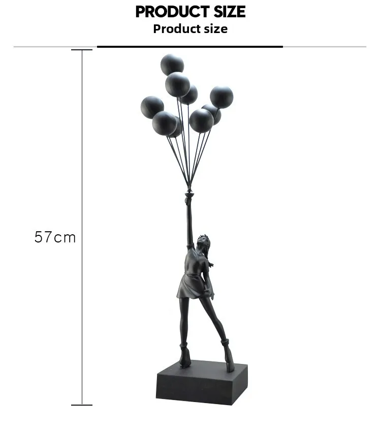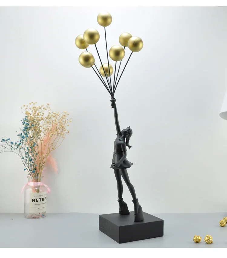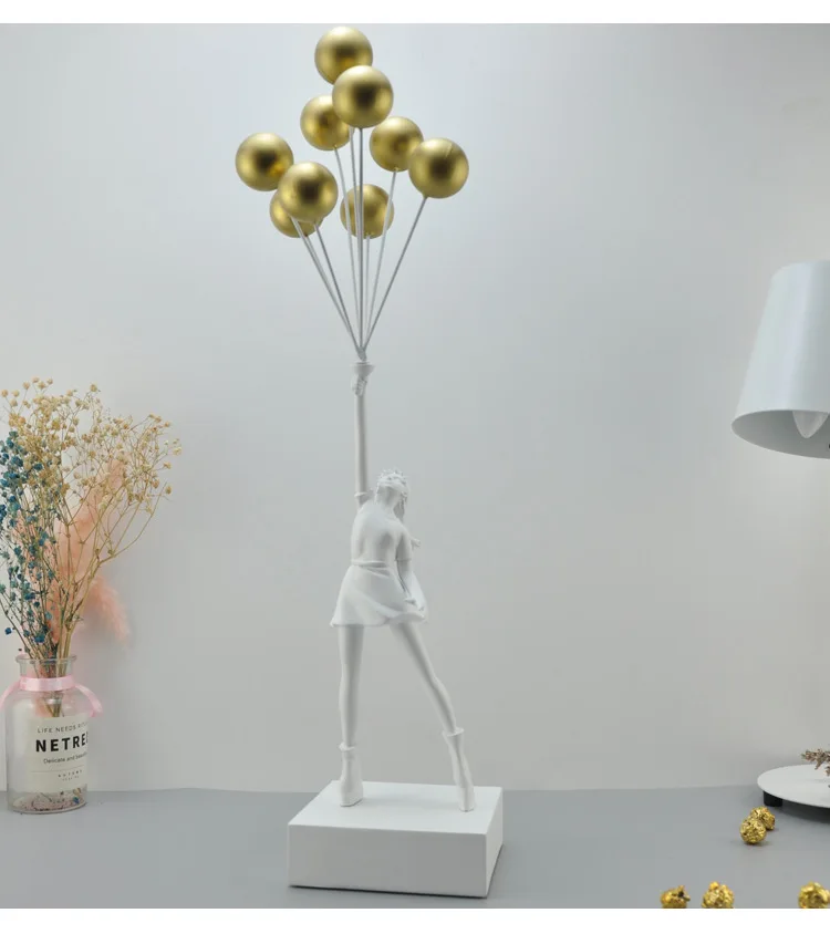 Resin construction with rectangular base. Four finish options: Black, White, Gold, Red. Each finish applied uniformly across figure, balloons, and base.