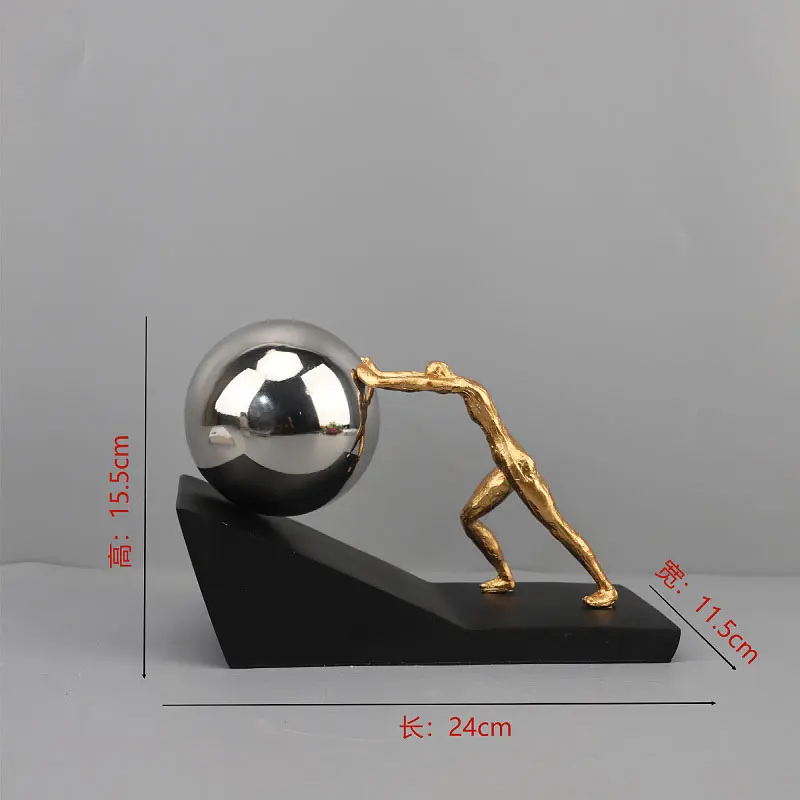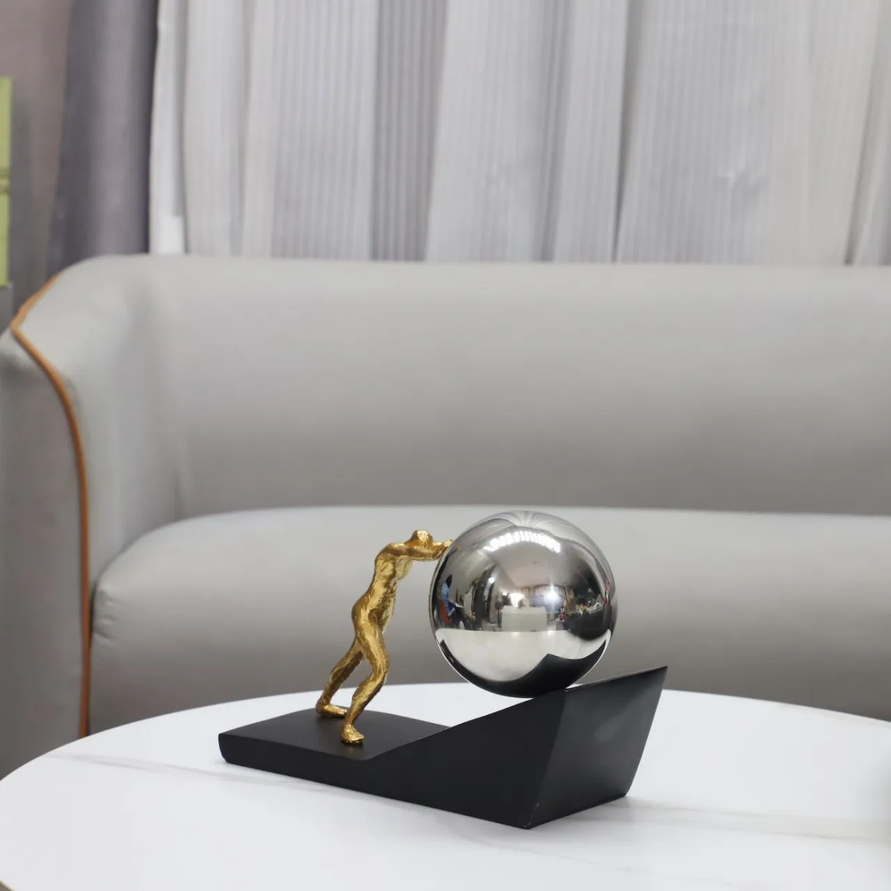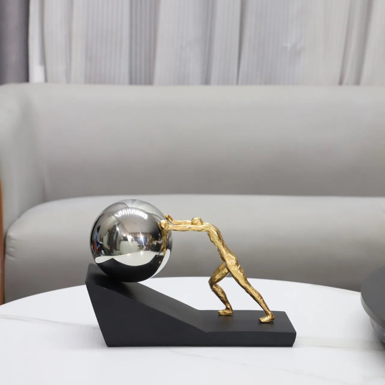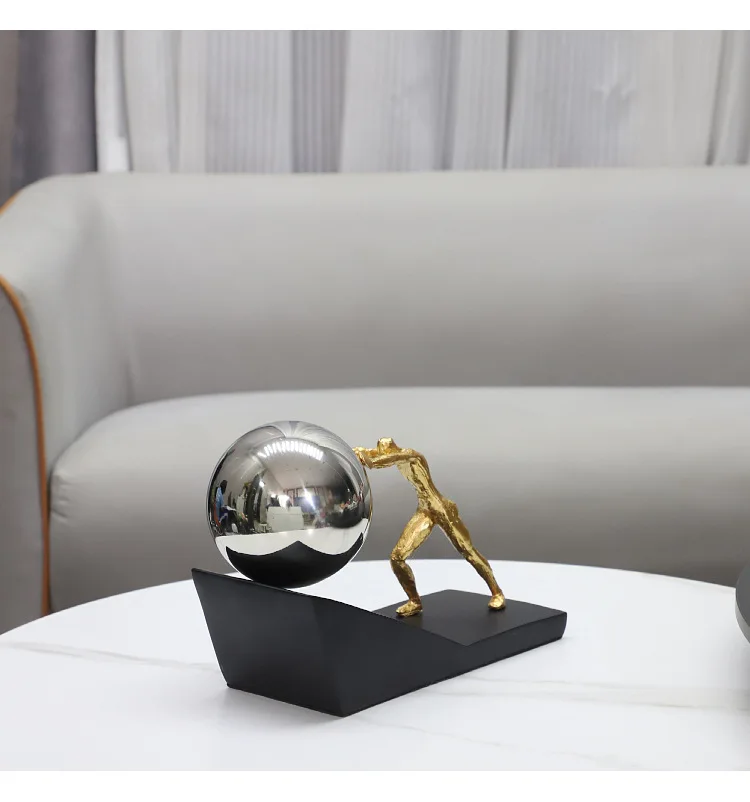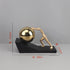 The contrast between the textured matte gold figure and the high-gloss sphere creates a material tension that makes the composition visually interesting from every angle. The matte black base grounds the piece with quiet authority, letting the gold and metallic finishes command attention above it.