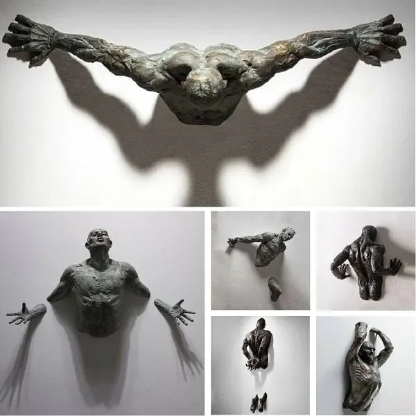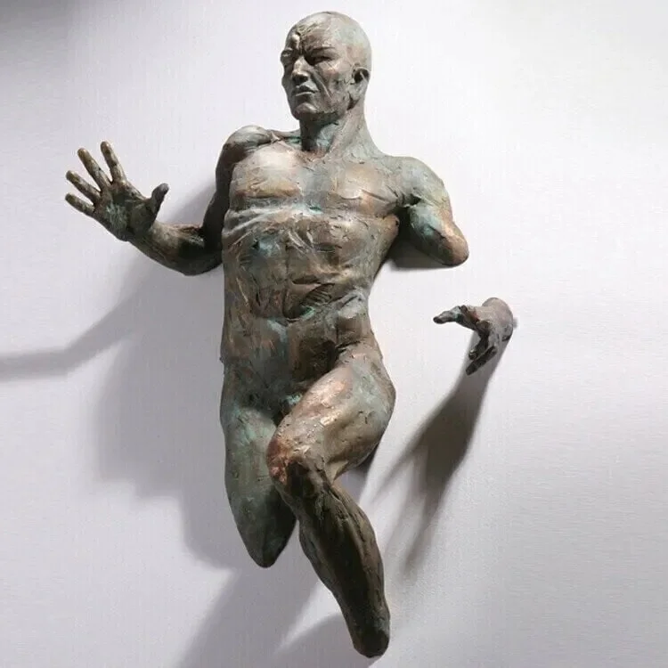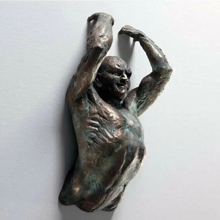 Abstract human form sculpture appearing to break through or climb through wall. Resin construction with electroplated copper-tone finish. Three-dimensional figure extends from flat mounting base. Multiple pose variations available.