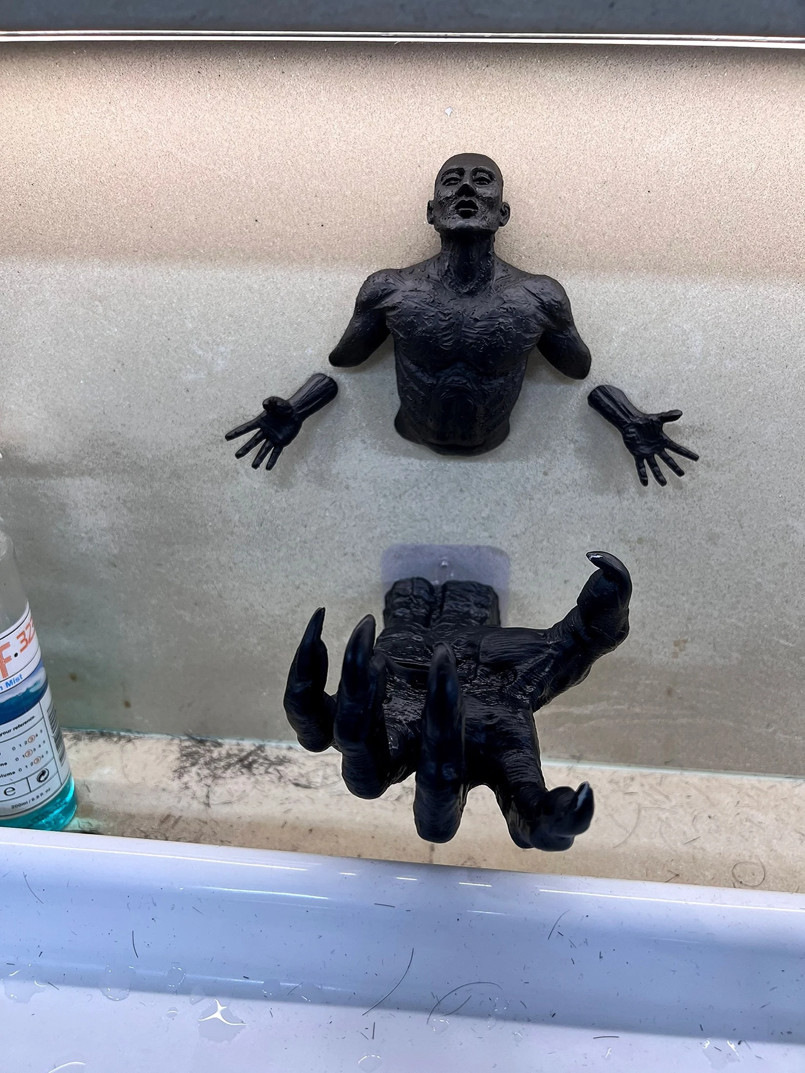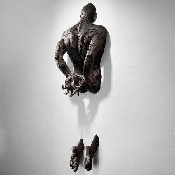 Figure positioned as if pushing through solid surface. Body partially visible, creating illusion of emergence from wall behind. Legs or torso embedded in mounting plate while upper body extends outward.