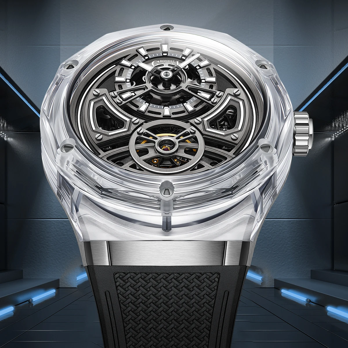 Frost Transparent: Clear case with gunmetal bezel accents and black rubber strap. Classic skeleton aesthetic with modern materials.