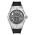 Automatic mechanical with visible skeleton architecture. Self-winding rotor powers the exposed gear train. Exhibition design on both dial and movement sides.