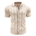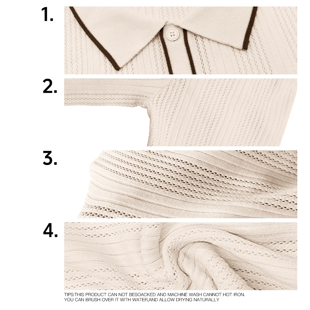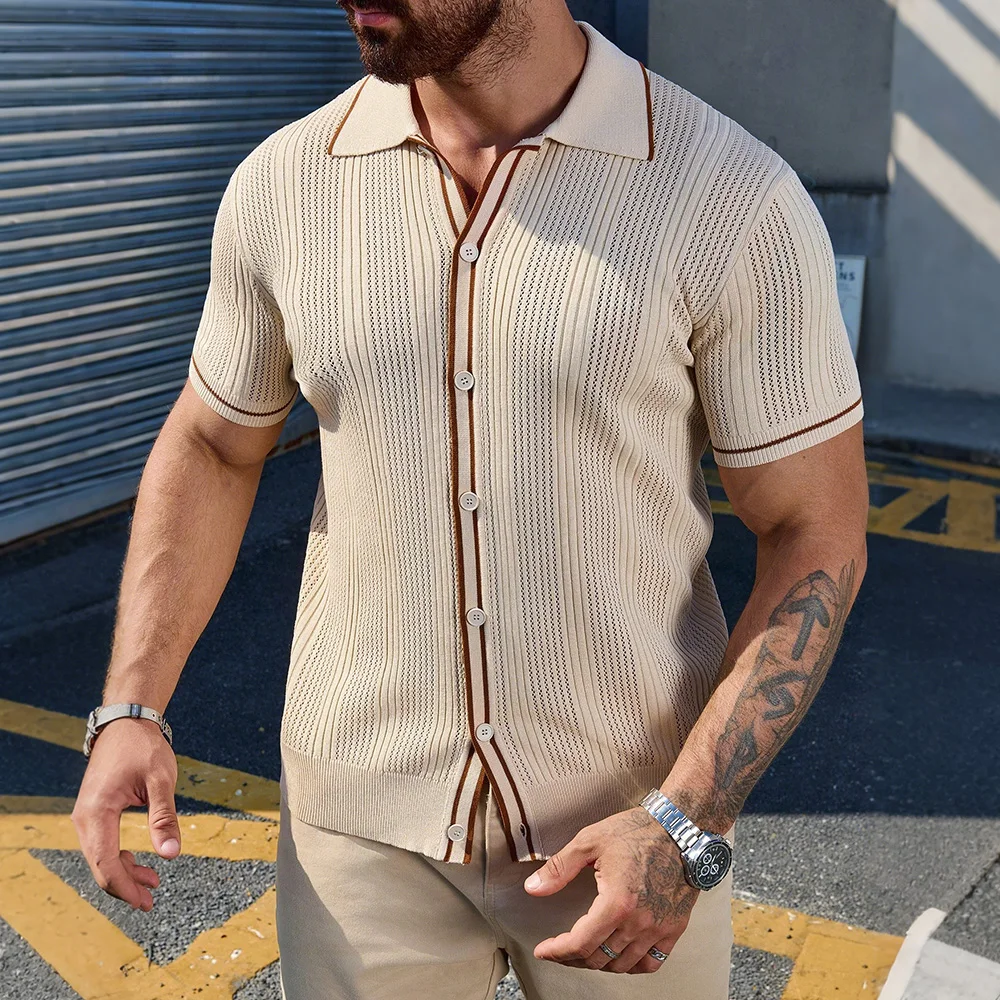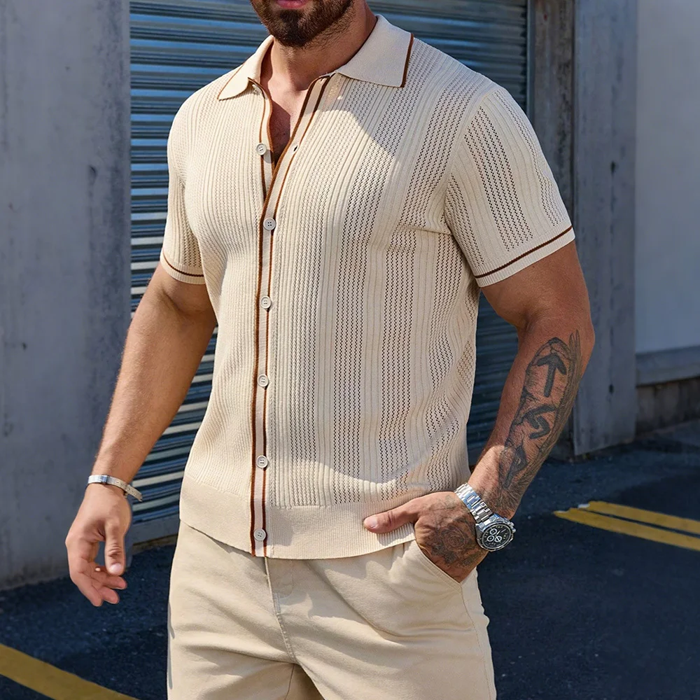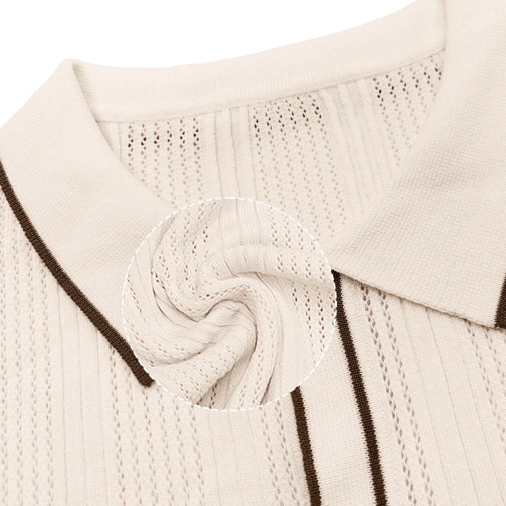 Vertical rib-knit construction adds dimensional texture while providing natural breathability. Button-front closure with contrast piping details. Classic polo collar. Short sleeves with contrast trim. Soft, elastic knit fabric moves with you while maintaining structure throughout the day.
