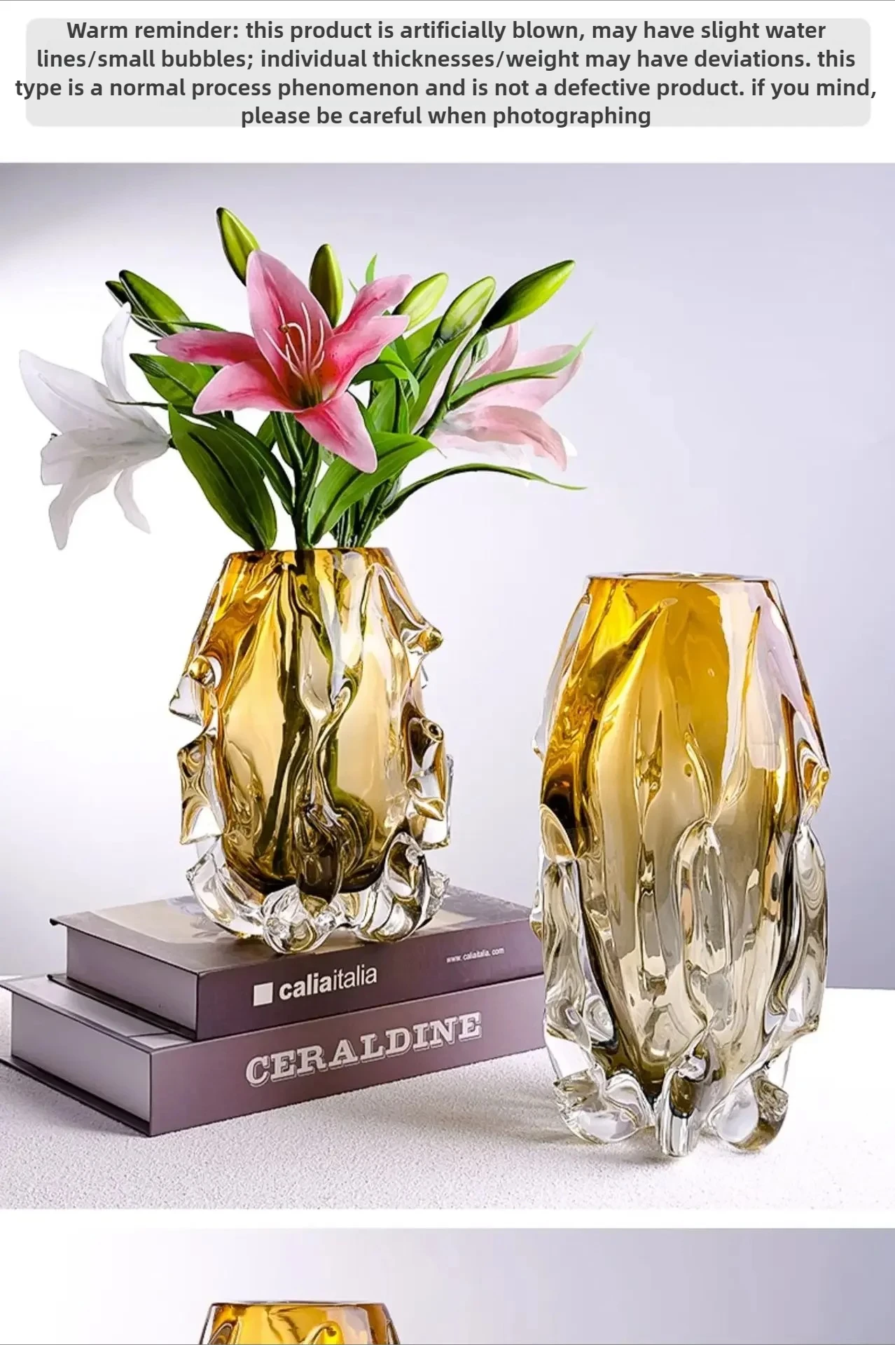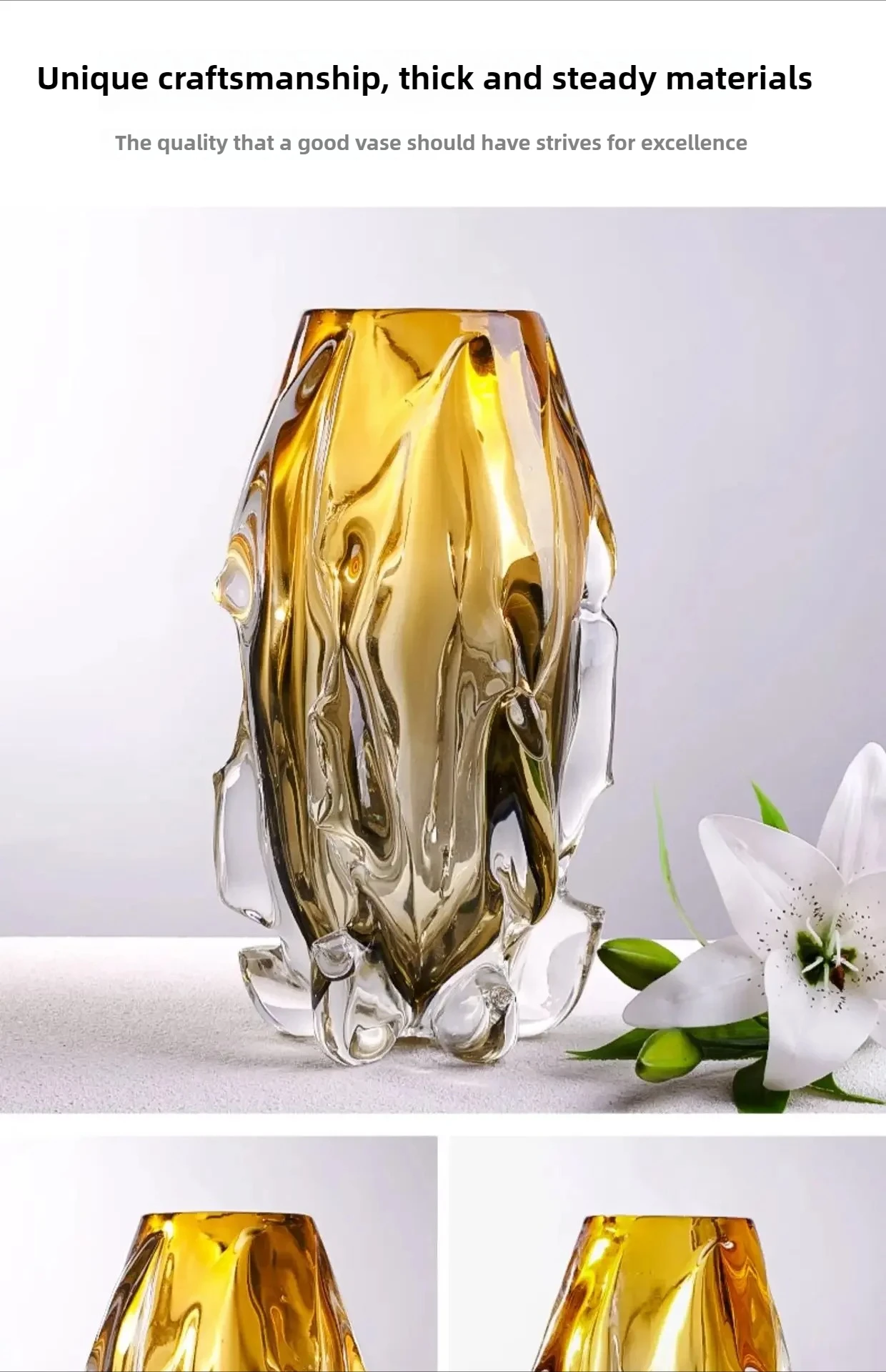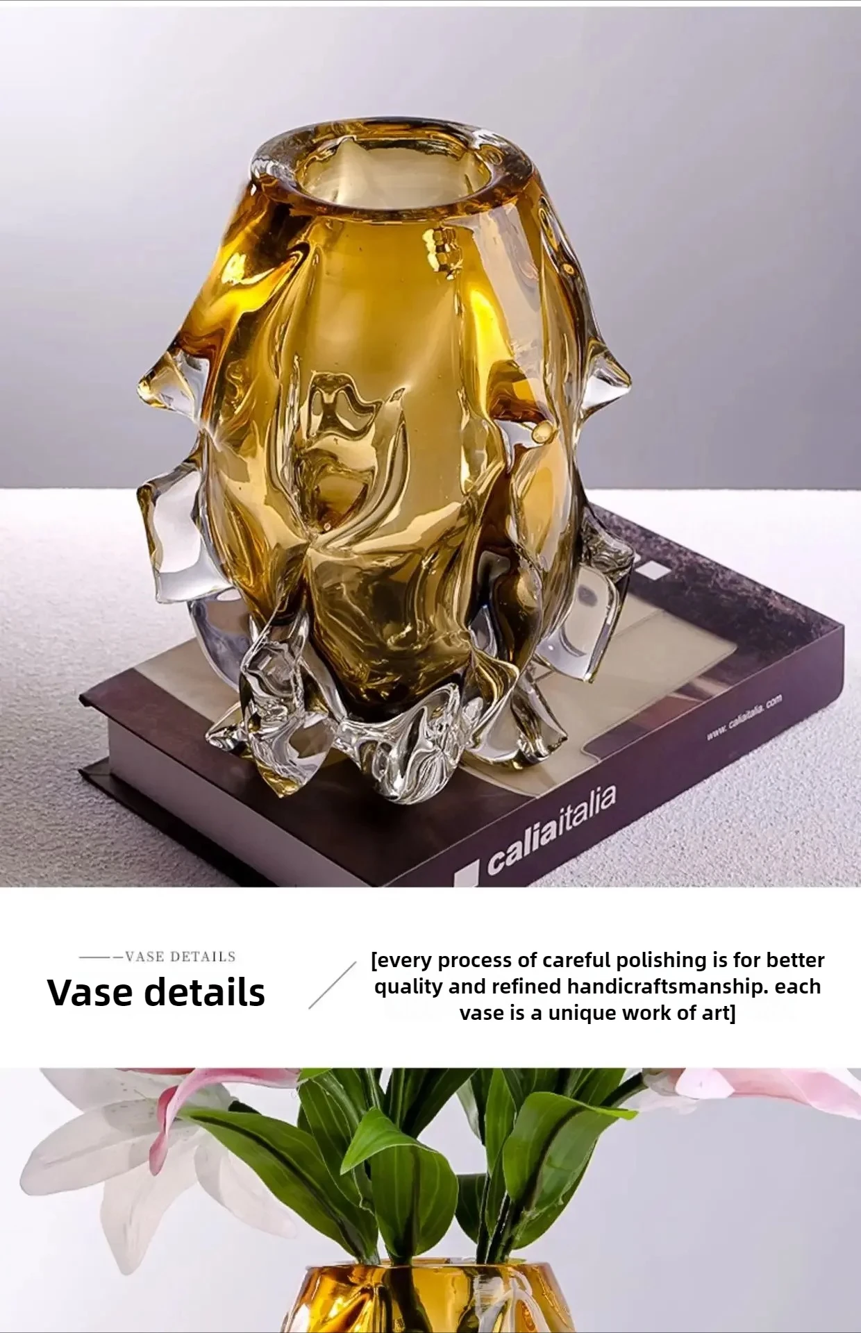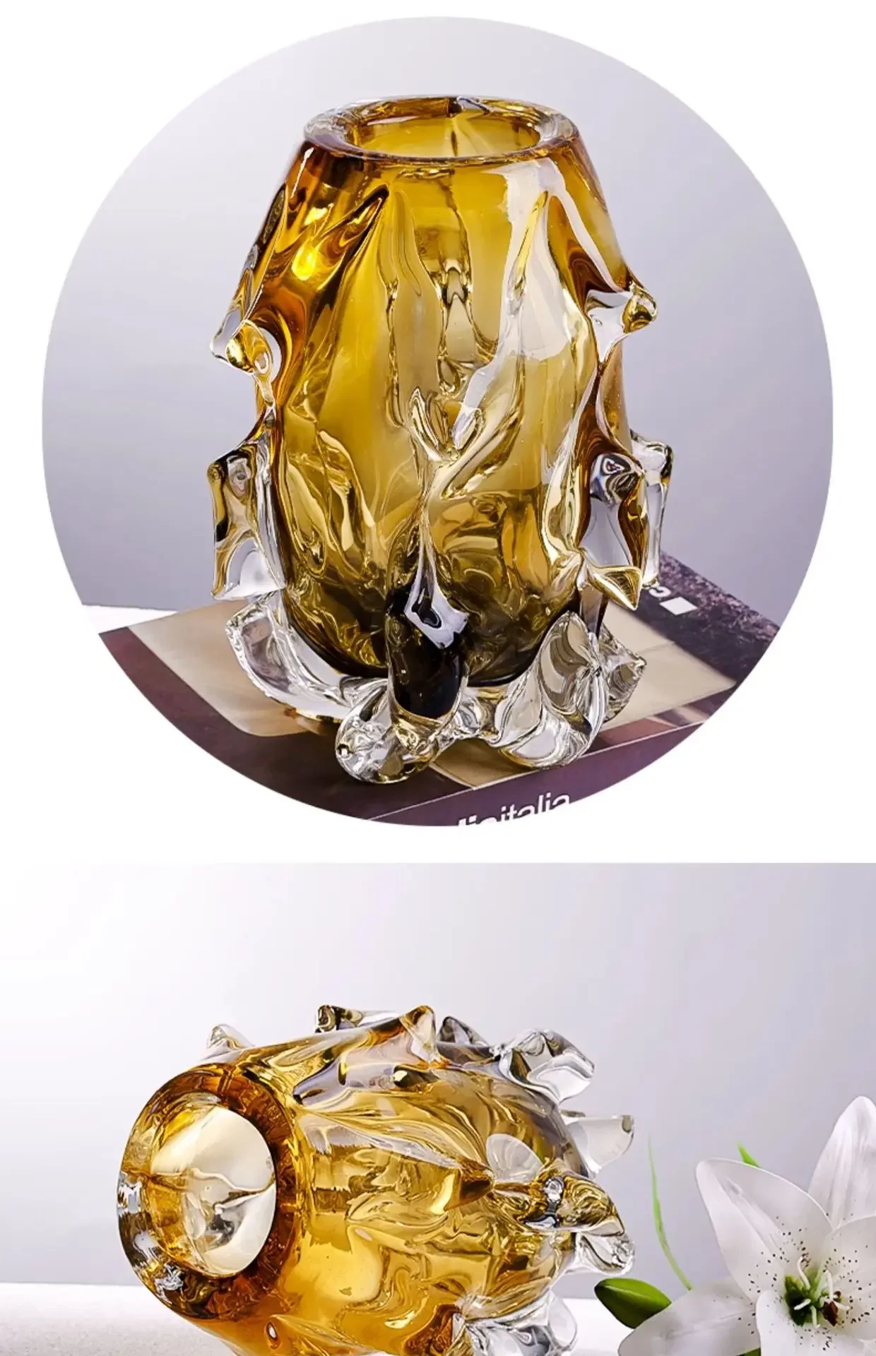 Flowing amber glass appears to emerge from clear crystalline flames at the base. Each vase is individually blown, creating unique variations in color depth and form. The organic shape suggests frozen movement, like molten glass captured mid-flow.