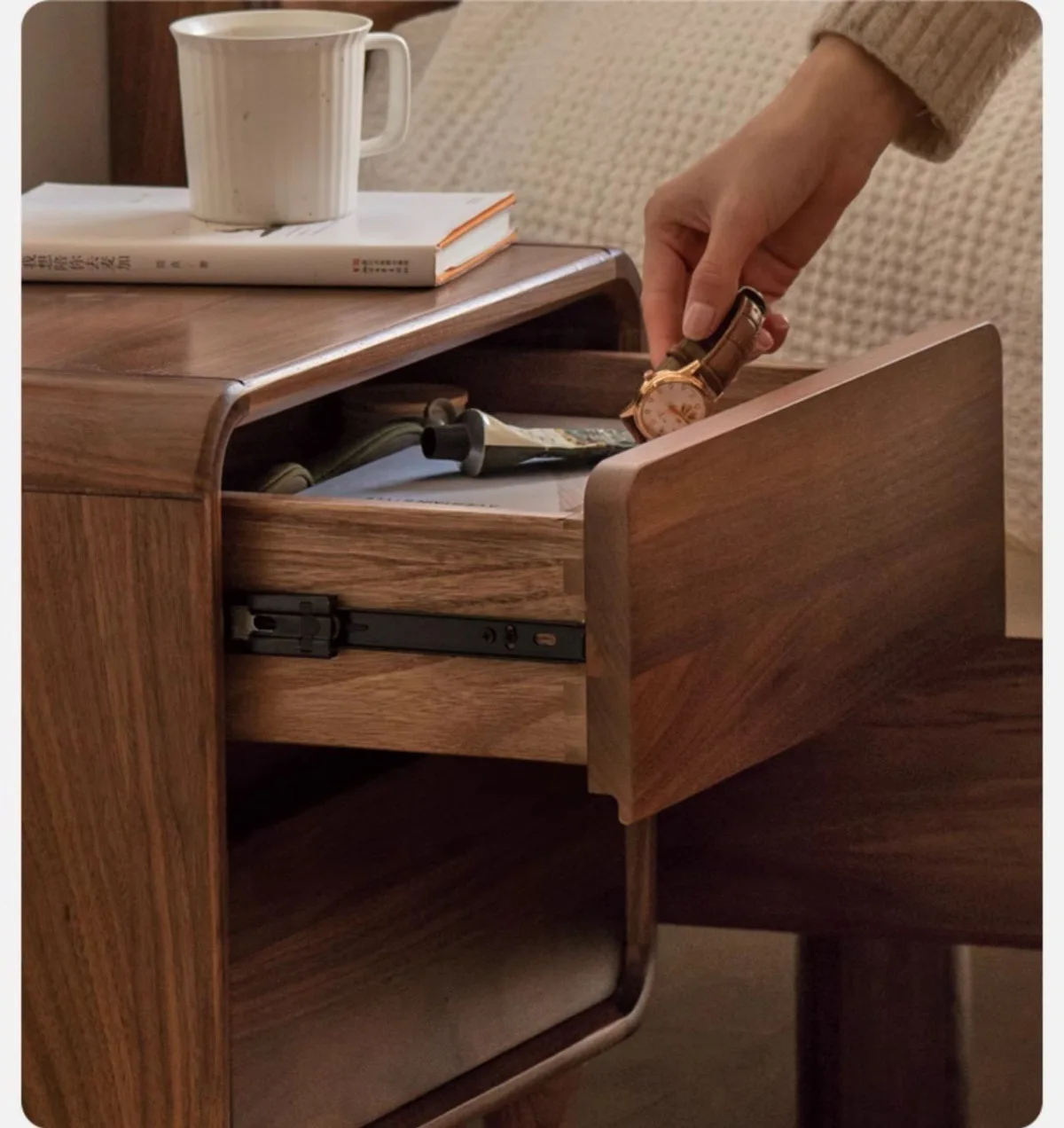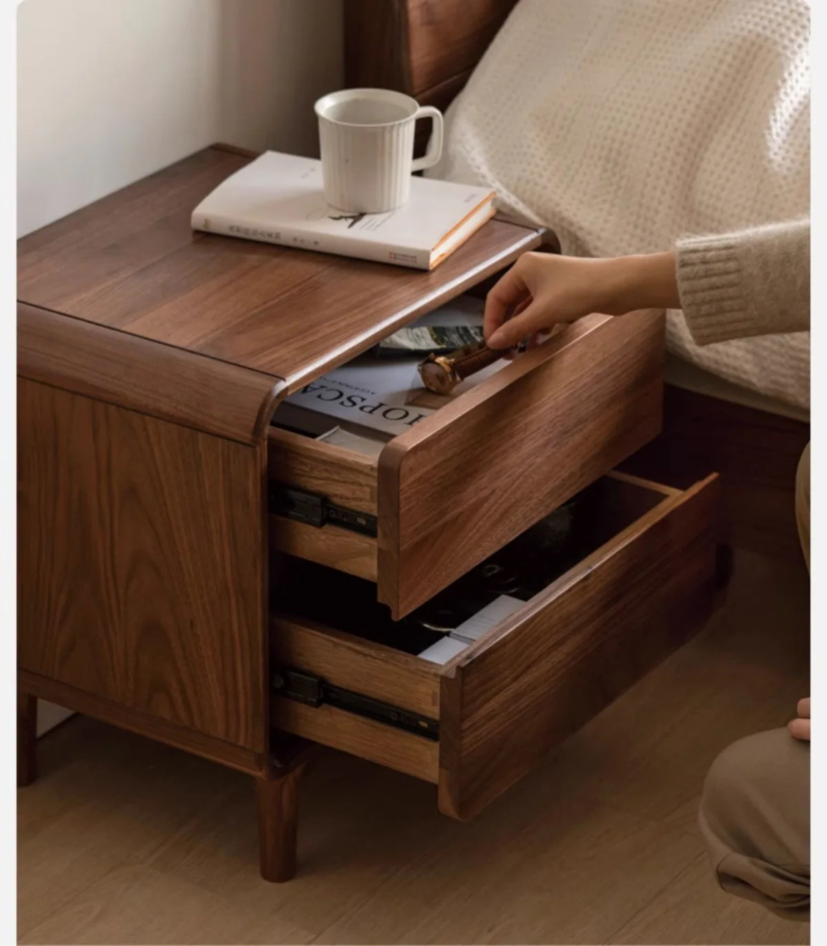 Two spacious drawers for organized storage. Top drawer: glasses, phone, reading materials, medications, small essentials. Bottom drawer: books, electronics, personal items, extra bedding.